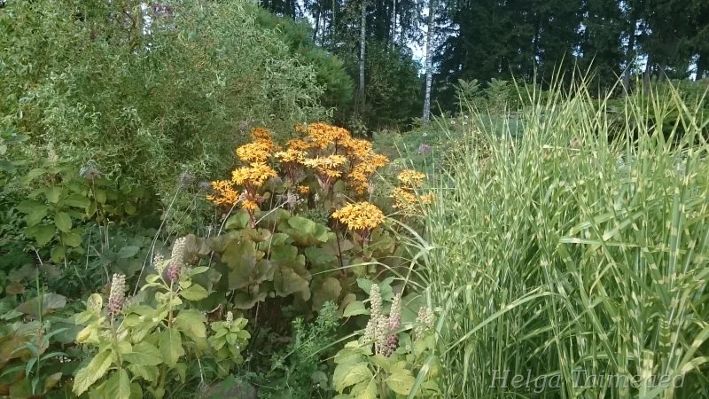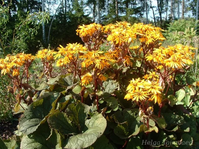 Весной появляются эффектные пурпурные листья, которые постепенно достигают высоты 50-90 см ко второй половине лета, в зависимости от места произрастания. С июля на крепких пурпурных цветоносах появляются оранжево-желтые корзинчатые цветки высотой 120-150 см. Место произрастания должно быть плодородным, влажным и относительно полутенистым. Привлекает множество пчел и бабочек.